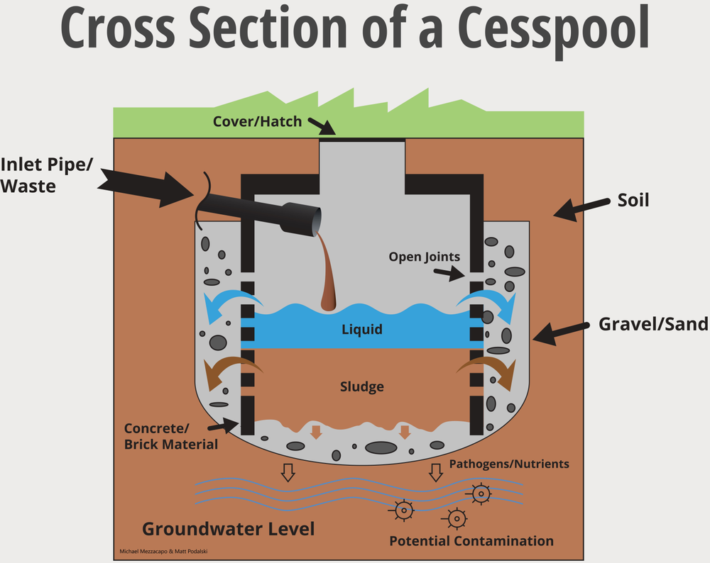 A cesspool is a hole in the ground receiving untreated wastewater. Cesspools pollute the environment and endanger public health.