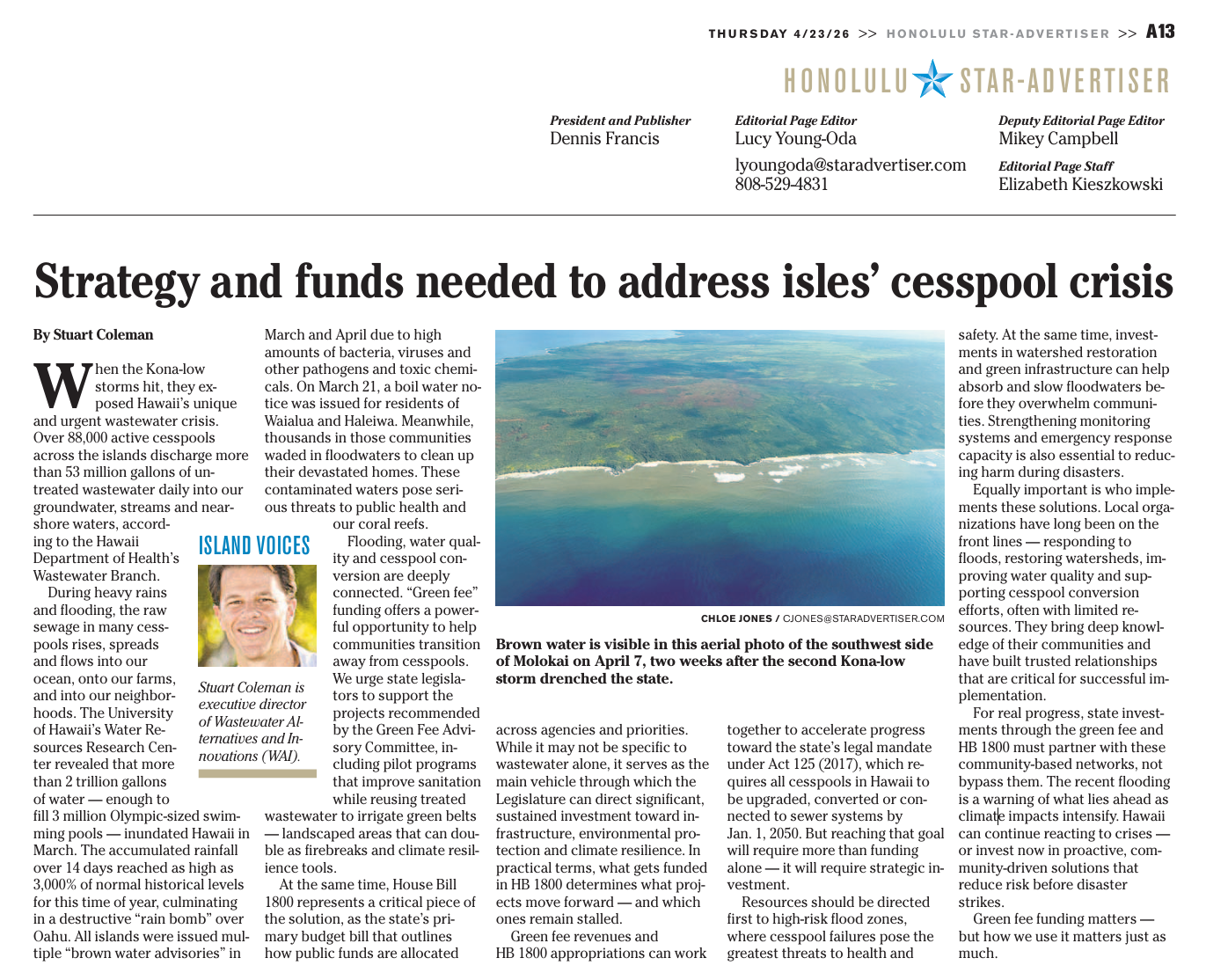 Honolulu Star Advertiser - Strategy and Funds need to address isles’ cesspool crisis Apr 29 - Written by Stuart Coleman Read here: https://www.civilbeat.org/2026/02/hawaii-homeowners-need-more-options-get-rid-cesspools-2050/